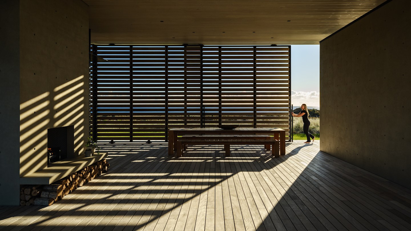 The building is composed of four interconnected rectangular pavilions arrayed around a courtyard and pool. The gently rounded roof – connected to the foundations with fine steel columns – appears to hover, allowing sight-lines through to the spectacular South Pacific vista. Kundig refers to this roof as “the surfboard” and indeed, from a distance, the hydrodynamic form does resemble a classic longboard casually flung down among the dunes.