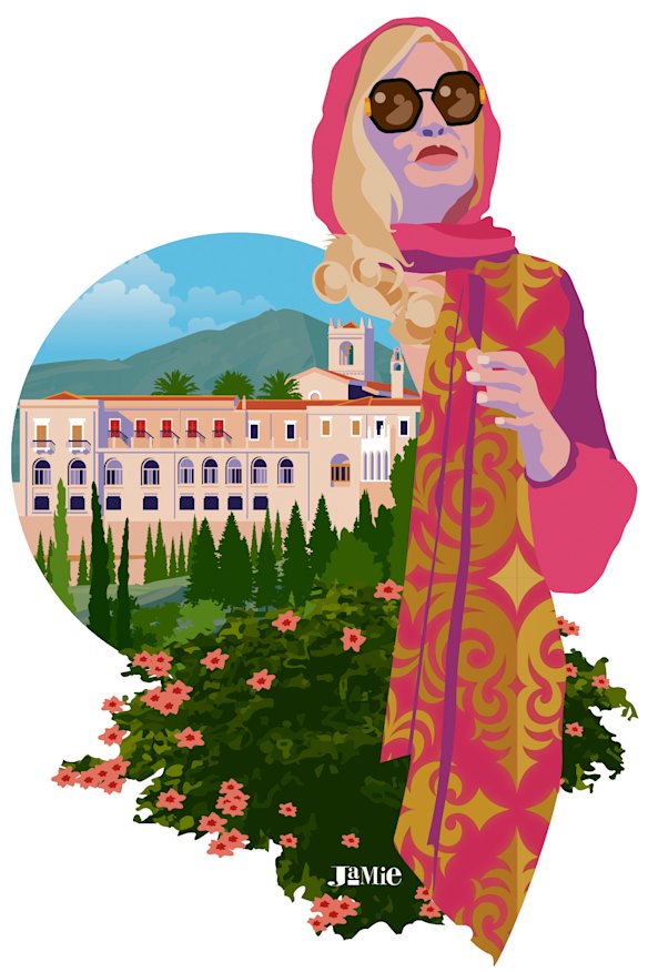 My floor-length dress is widow-black – the very opposite of Coolidge’s tutti-frutti palette – but dramatically twists and knots at the navel. It cost me only $US10 ($14.90) at an op shop in Springfield, Missouri – a fact that gives me enormous pleasure as I parade it everywhere from my poolside deckchair (with a view of a smoking Mount Etna) to dining at the hotel’s Michelin-star restaurant. No one bats an eye, even when I pair it with white sneakers (I travel carry-on-only, which limits footwear choices).
