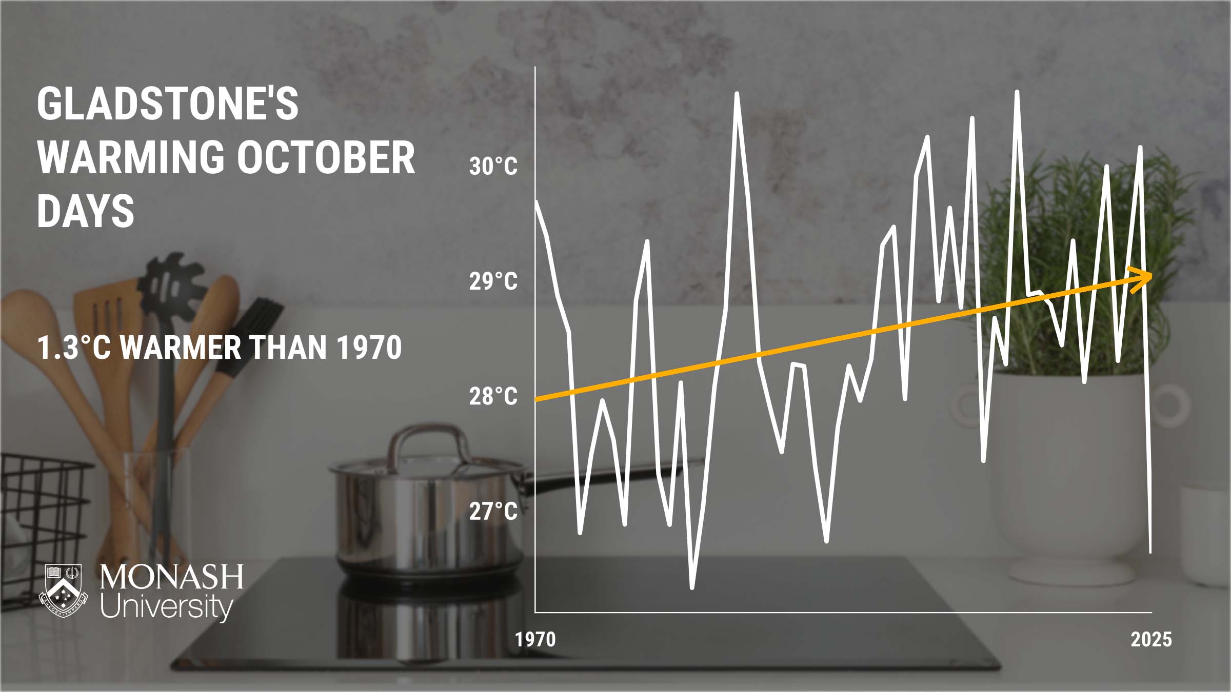 Here in Gladstone the average October day is now around 1.3C warmer than 55 years ago.