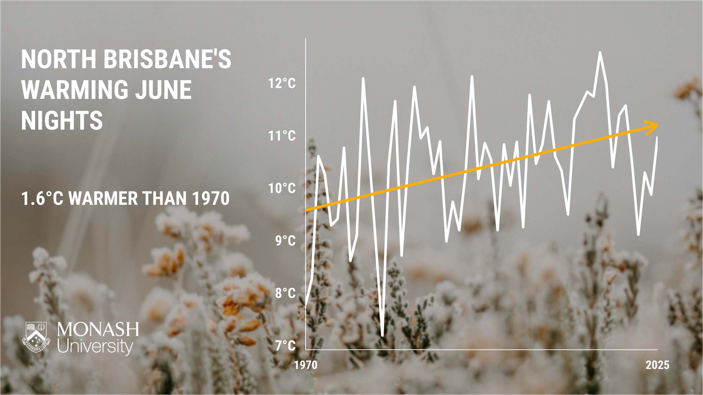 We've seen changes here in north Brisbane, with the average nighttime temperature during June now around 1.6C warmer than it was 50 years ago.