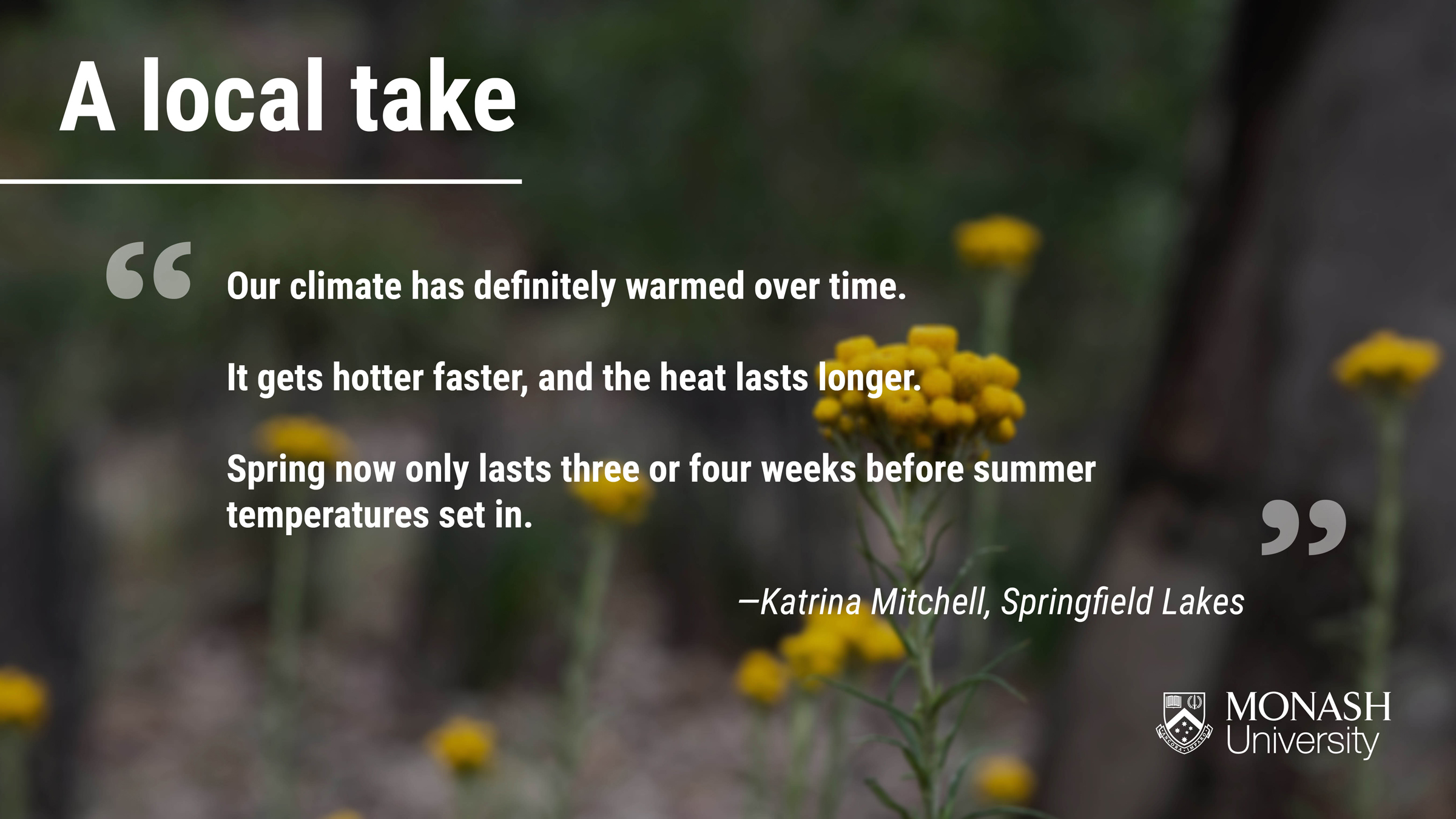 Host of Springfield's Changing Climates series, Dr Christa Pudmenzky, explains how our local climate is changing. Plus, how do warmer temperatures impact iconic Aussie sporting events?