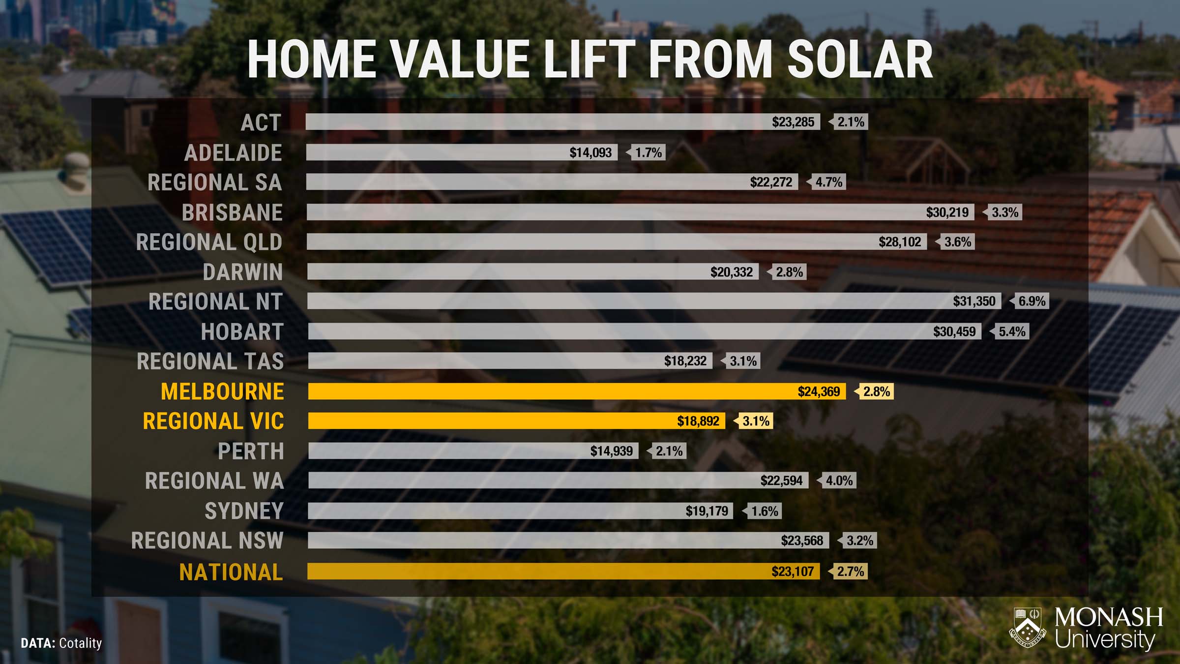 In Melbourne solar power systems add an average of $24,369 to the property value, while in regional Victoria that sits at around $18,892.