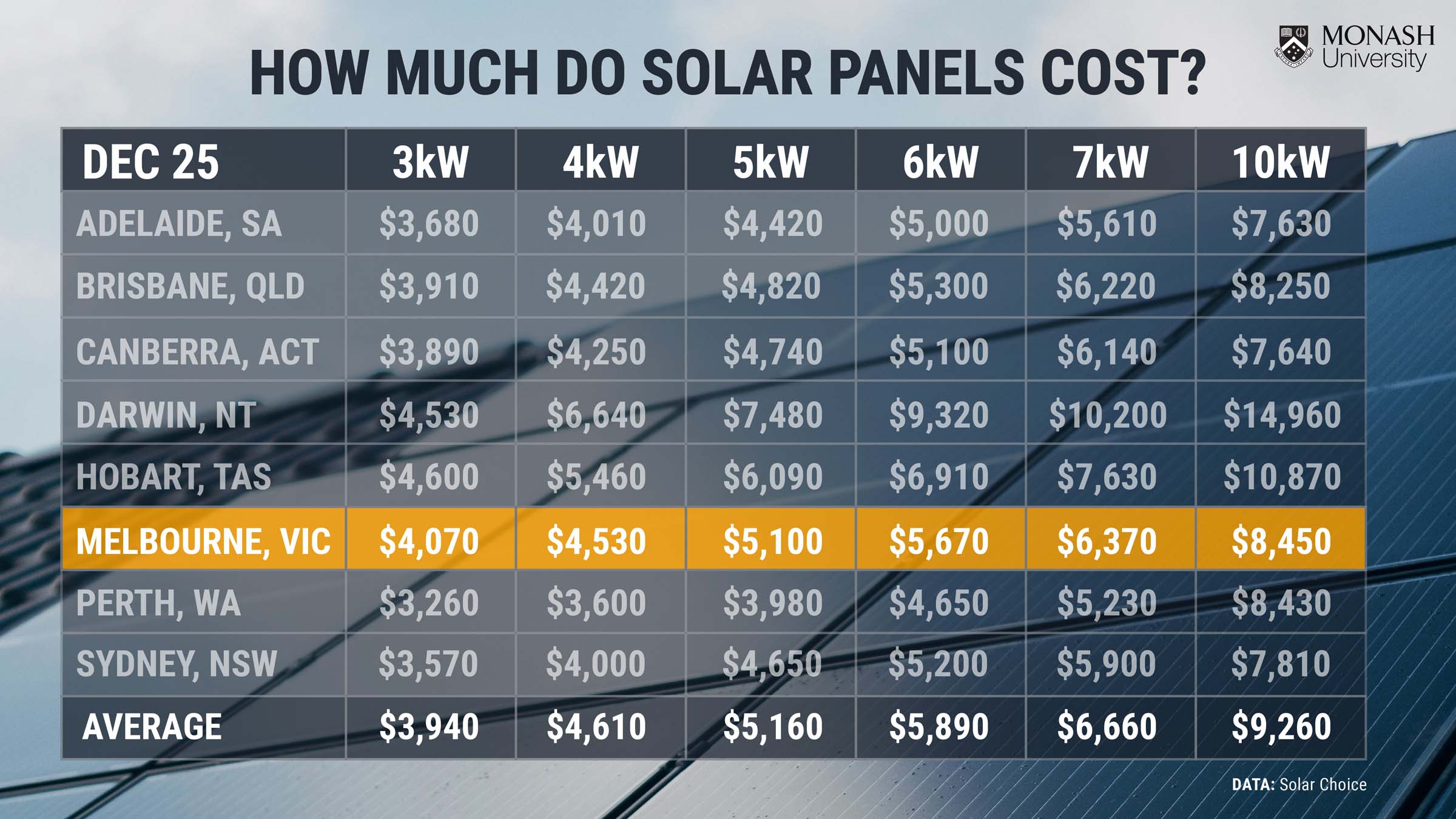In Melbourne for example, the average cost of installation sits between $4070 for a 3kW system and $8450 for a 10kW system.