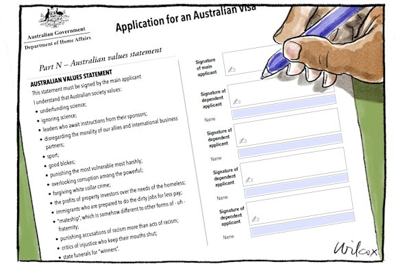 What Australian values do the Liberals intend asking immigrants about? Will you be buying a sausage outside Bunnings? Will you be drinking XXXX or VB rather than imported beer? Will you be taking a sickie when the fish are biting out in the bay?